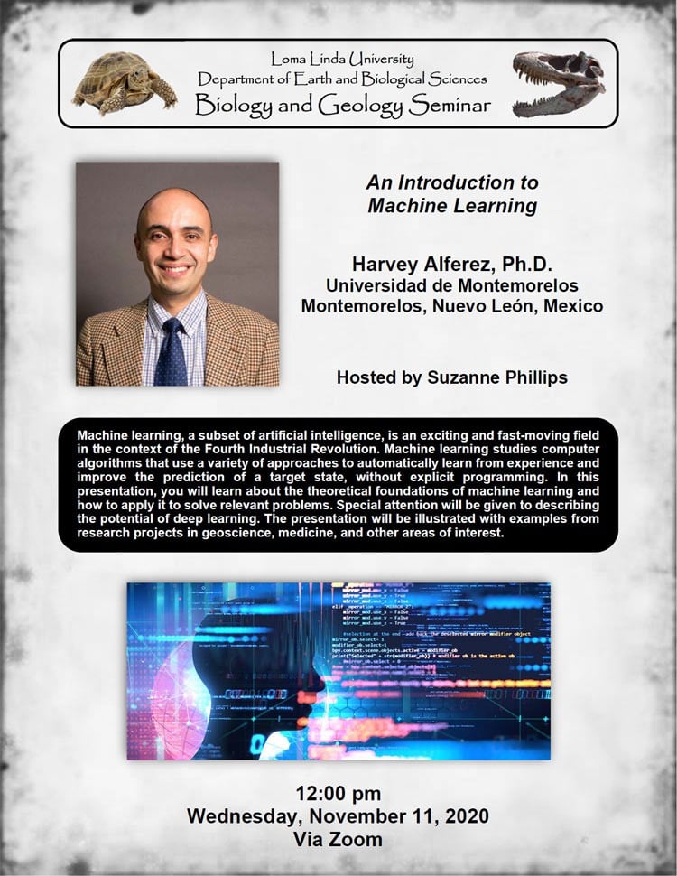 An Introduction to Machine Learning: seminar presented at the Department of Earth and Biological Sciences, Loma Linda University, USA. November 11, 2020. Promotional poster.
